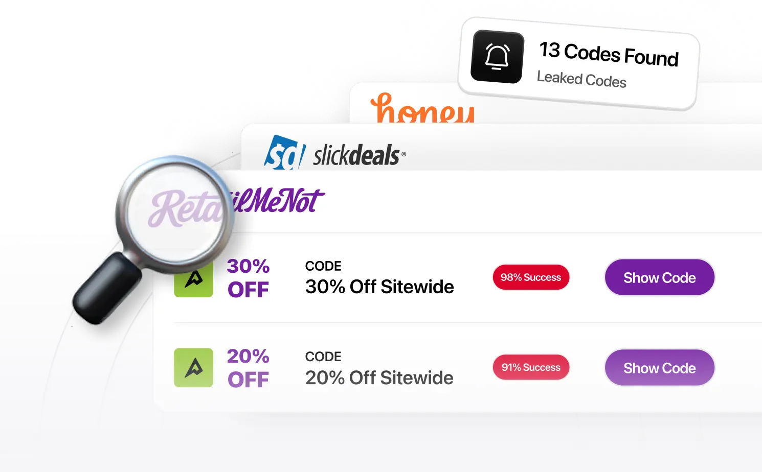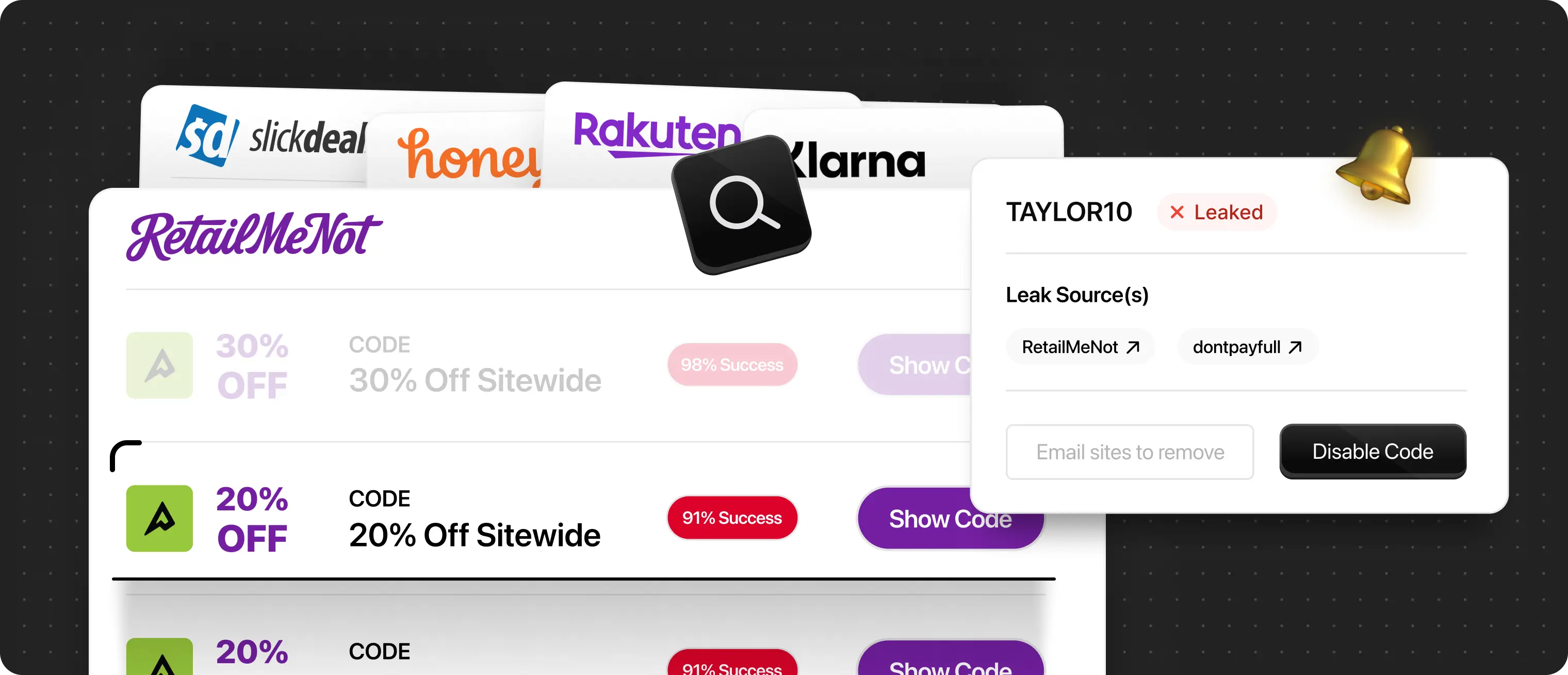 Auto-scan discount sites, alerts of leaked codes & auto-send removal requests.